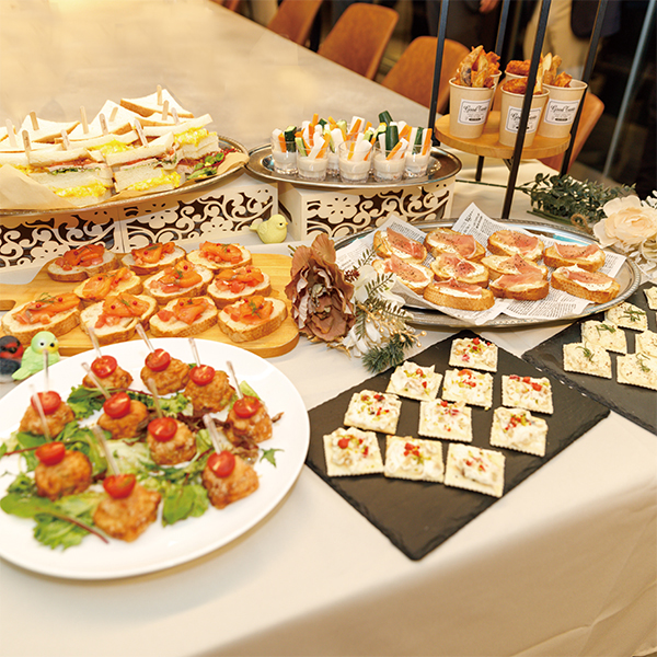 フライドチキン/フライドポテト/サンドイッチ2種/フリッタータとミニトマトのピンチョス/季節野菜のディップ(バーニャカウダソース)/クリームチーズとドライフルーツのカナッペ/スモークサーモンのブルスケッタ